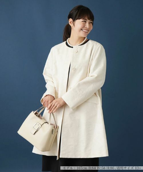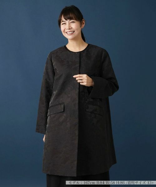 うっすらとボタニカル模様が浮かぶ、膨れジャカード織りのミディ丈ノーカラーコート。フロントはスナップ&ボタンを隠した比翼仕立てですっきりとした印象に。シルエットには程よくゆとりをもたせ、リラクシーな着心地を叶えました。ウエスト高め位置にはフラップポケットが斜めにレイアウトされ、絶妙なバランスのアクセントに。シンプルな色使いで統一感があり、遠目から見ると無地にも見えるのでボトムスとコーディネートしやすくなっています。
