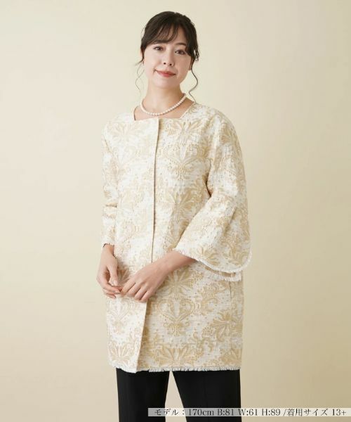 ナチュラルな風合いの生地に、立体的なボタニカル刺繍が施されたロング丈のノーカラージャケット。スクエアネックがデコルテを綺麗に覗かせ、絶妙な抜け感を演出。袖口部分を切り替え、フレアにアレンジすることで軽やかなニュアンスに。アウトラインは断ち切りフリンジで仕上げ、味わい深い表情を作り出しています。前ウエスト両サイドにはスリットポケットをバランスよくレイアウト。ヒップまですっぽりと隠れる丈感で体型カバーもお手のものです。フロントはスナップボタンによりスムーズに着脱が可能。
