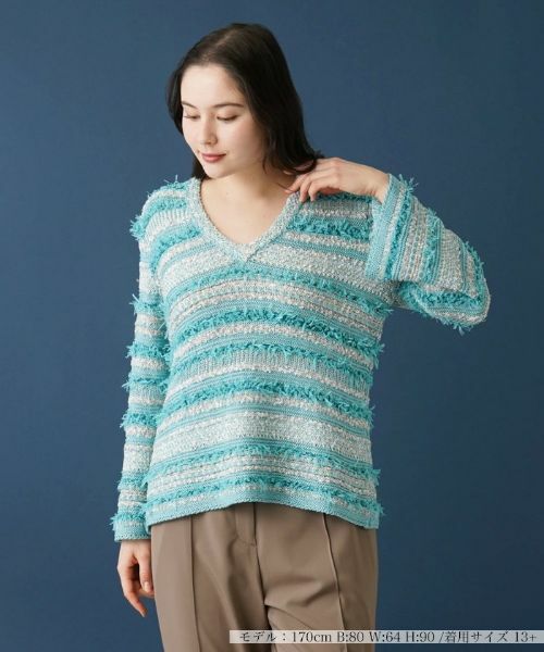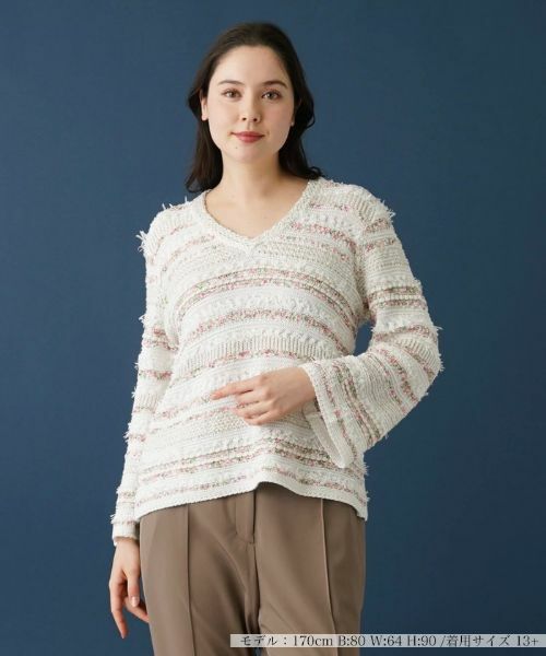 ラメ糸を交えたミックスヤーンが作り出す、絶妙な色合いが特徴的なVネックニットプルオーバー。ボーダーパターンの表情豊かなテクスチャが目を惹きます。ネックラインはすっきりと開き、バランスのよい抜け感をアシストします。定番のシンプルなパンツやスカートに合わせるだけで洗練された大人カジュアルを演出。日常のカジュアルなシーンでも上品なムードのスタイリングが楽しめる注目のトップスです。