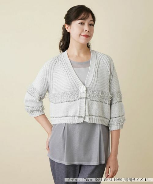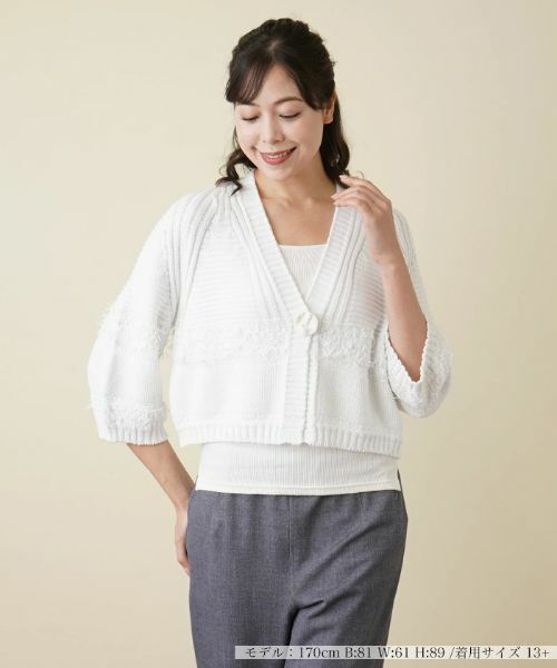 独創的な編み地のパターンが、他にはないユニークな表情を見せるショート丈のニットカーディガン。デコルテを美しく引き立てるすっきりとした深めのVネックが洗練された抜け感を演出。フロントには個性を放つ大きめのボタンと実用的なスナップボタンを配し、機能性と見栄えのよさを兼ね備えたデザインに。パンツルックはもちろん、フェミニンなスカートとのコーディネートにも自在にマッチし、季節のスタイリングを新鮮な印象にアップデート。オフィスでもプライベートでも、ひと味違った着こなしを演出できるアイテムです。