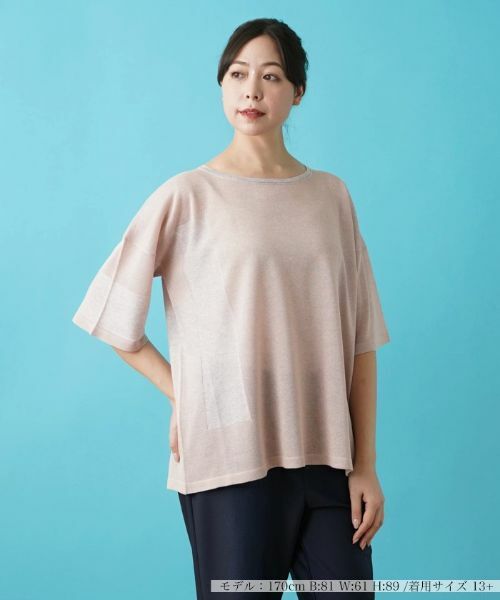 煌めくラメを散りばめ、配色ラインでアクセントを効かせた七分袖のニットプルオーバー。レーヨンをブレンドしたやや薄手のニットの優しい肌触りが感じられる一枚です。ネックラインは浅めに設定し、上品かつ落ち着いたニュアンスに。ドロップショルダーでゆとりをもたせ、肩肘張らないリラクシーな着心地を叶えました。パンツにもスカートにも合わせやすく、着回し力に優れたアイテムです。