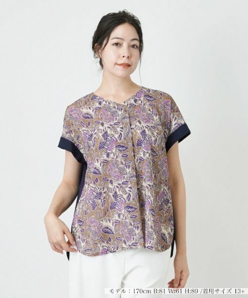 ひと味違った表情が楽しめるアーティスティックなボタニカル柄をプリントしたブラウス。袖口や後ろ身頃はシンプルな無地で切り替え、巧妙なバランスでデザインしています。程よいリラックス感をもたせつつも、すっきり見えするシルエットで着こなしやすく、ヘムラインはサイドラウンドカットでまろやかなニュアンスに。定番のパンツはもちろん、フェミニンなスカートとも好相性。バックネックの涙あきはループボタンにより開閉が可能です。