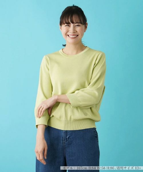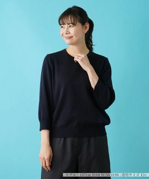 シンプルな七分袖ニットインナー。オリジナルモチーフを左裾に刺繍して、アクセントにしています。さらっとした風合いが特長のコットン糸を使用しています。春から初夏にかけて便利に着回しできます。