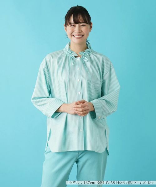 春らしいミントグリーンが印象的なブラウス。レリアンオリジナルの先染めシャンブレーのストライプシャツ地を使用しています。衿に入ったギャザーとリボンがフェミンンで女性らしい印象に。裾は前後差をつけているので気になるヒップまわりをカバーできます。