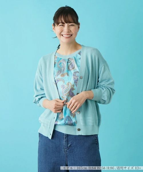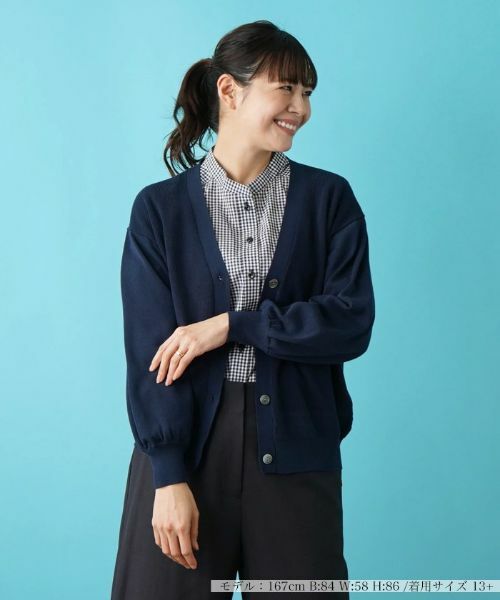 コットンブレンドの軽やかな着心地がこれからの春夏シーズンに嬉しい、Vネックニットカーディガン。ドロップショルダーが生み出すリラックスシルエットで気負わずにスタイリングでき、カジュアルからオフィスまで幅広いシーンで活躍してくれそうな一枚です。ヘムにあしらわれたボーダー状の柄編みが表情にニュアンスを加え、着こなしに深みをもたらします。