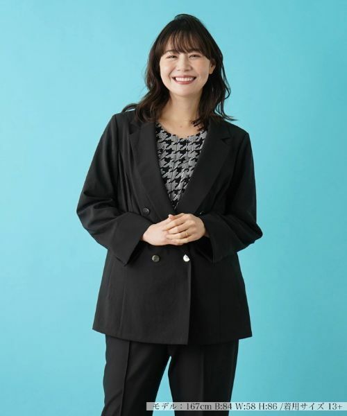 ちょっぴりメンズライクな雰囲気をかもし出すダブルブレステッドジャケット。ボタンを開けて羽織るように着こなすとこなれ感がアップします。軽い着用感が魅力のポリエステルを採用し、シーズンスタイルにぴったりの1枚に。