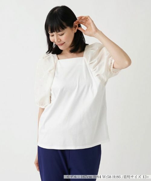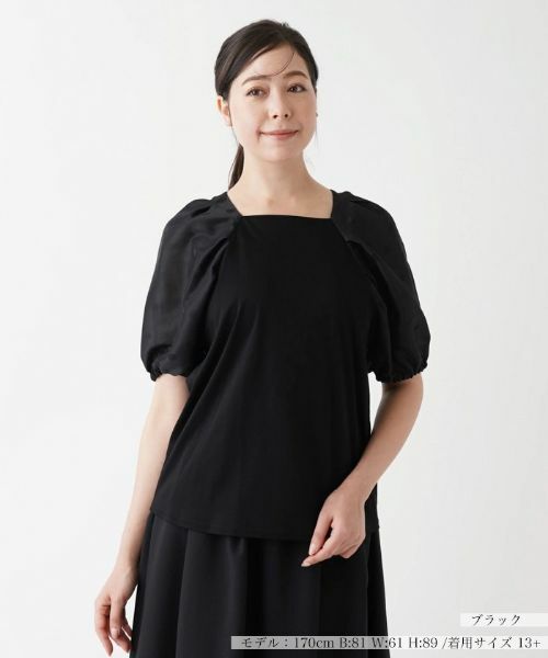 ドット柄が浮かび上がるジャカードサテン素材のふっくらボリュームスリーブが、大人キュートなシルエットをメイク。一枚着はもちろん、キャミワンピやジャンパースカートのインにもぴったりのスクエアネックカットソー。