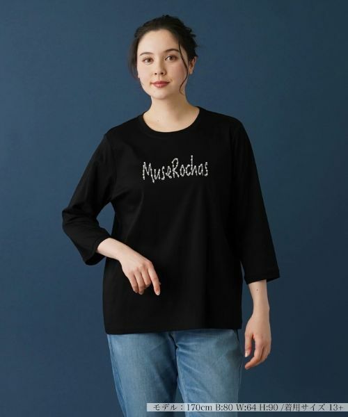 柔らかなコットン素材が快適な着心地を提供する、肌馴染みのよい七分袖カットソー。ジャケットやカーディガンとの重ね着にも使える着回し力に優れたアイテムです。フロントに施された“MUSE ROCHAS”のロゴプリントにパール調のビジューを添えることで、上品ながらも遊び心ある仕上がりに。大人の可愛らしさをさりげなく演出し、これからの季節のカジュアルスタイルに新鮮なアクセントを加えてくれそうな一枚です。