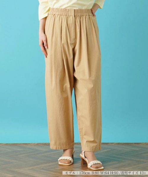 これからの季節のカジュアルルックで何かと重宝しそうなワイドパンツ。さらりとしたやや薄手のコットン生地を使用し、快適なはき心地を実現した一本です。前ウエスト周りにタックを施し、程よいリラックス感のあるシルエットでデザインされています。バックにはシンプルなポケットをバランスよくレイアウト。ウエストは総ゴム仕様とし、心地よいフィット感をもたせました。トップスをタックインすれば脚長見せのスタイルアップも期待できそうです。