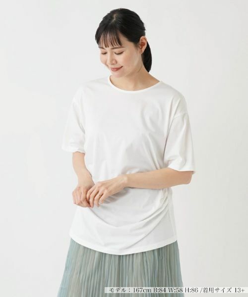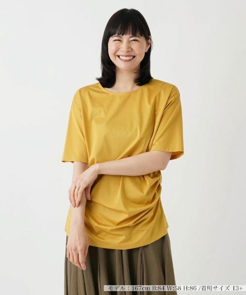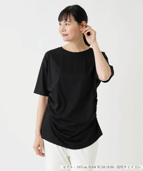 サイドに施したシャーリングが優雅なドレープラインを描き出す、ラウンドネックの五分袖カットソー。どんなテイストの着こなしにも溶け込んでくれるシンプルなデザインは、着回しに大活躍すること間違いなしです。