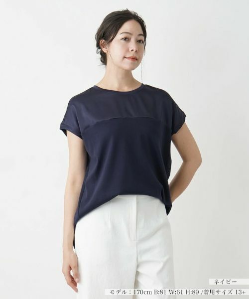 前後のヨークのシャイニーな異素材切り替えがアクセントになった、カジュアルな中にもエレガントな魅力を放つフレンチスリーブカットソー。滑らかな肌触りのコットン生地を使用し、優しい着心地を叶えました。首周りに沿うような浅めのネックラインやリラックス感のある袖のカッティングもポイント。バックにはセンタープリーツを入れ、キレイなシルエットを作り出しています。一枚での着こなしはもちろん、ジャケットやカーディガンのインナーとしても活躍してくれそうなトップスです。