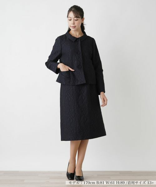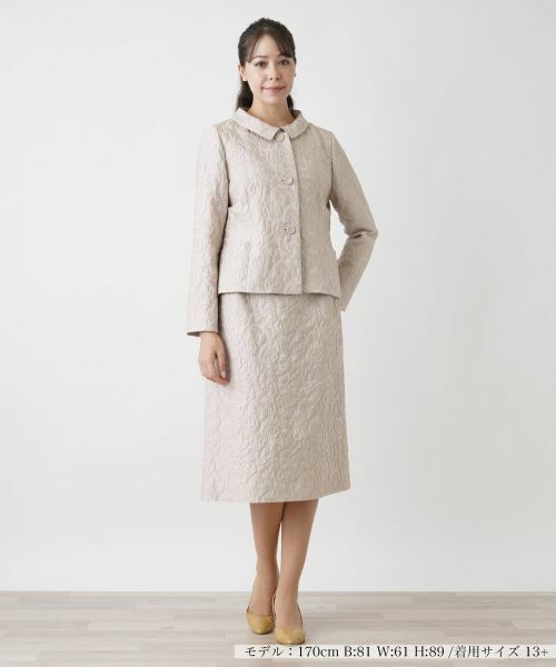 躍動感のあるフラワー柄のジャカード素材のスーツです。国内屈指のジャカード織りの産地桐生で生産された生地を使用しています。適度なハリ感と上品な光沢感を持たせ、軽く仕上げています。丸みのあるショールカラーとくるみ釦が優しい印象です。