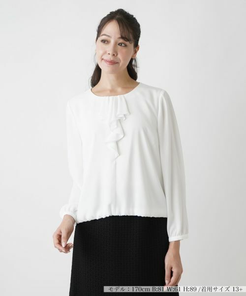 胸元フリルデザインのエレガントなブラウス。表情感のあるアムンゼン素材を使用。透けにくく美しいシルエットが出せる素材です。裾はゴム入りでインしなくても、自然にブラウジングされたシルエットになります。通勤はもちろん、入学式や卒業式にもお使いいただける定番のフリルブラウスです。素材表地 ポリエステル100% 裏地 ポリエステル100% 原産国日本手洗い可酸素系漂白可タンブル乾燥不可つり干し(日陰)アイロン低温120℃までドライクリーニング可ウェットクリーニング(弱い処理)