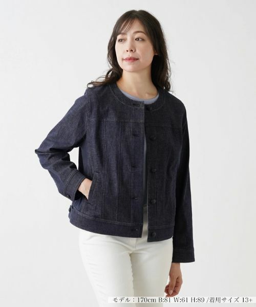 すっきりとしたシルエットのノーカラーデニムジャケット。身頃サイドや後ろ袖に異素材を組み合わせることで、さりげなく変化をもたせています。生地には程よいストレッチ性があり、動きやすく軽快な着心地を実感できるのも嬉しいポイント。シックなカラーでまとめているので落ち着いた印象に仕上がります。同色のエンブレムボタンがアクセントとなり、細部までこだわりを感じさせるデザインに。カジュアルなデニムに洗練されたディテールをプラスした、上級者らしいコーディネートが楽しめる一着です。