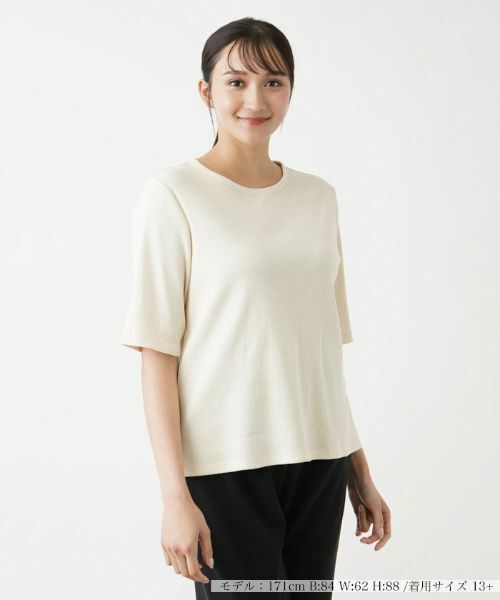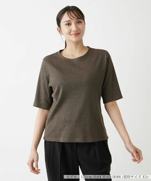 全体に繊細なラメが煌めく、シャイニーな表情のクルーネックカットソー。ネックラインは浅めに設定し、落ち着いた上品なニュアンスに。五分袖で絶妙なバランスの抜け感を作り、季節らしい軽やかな印象に仕上げました。遠目からだとシンプル見えするので着こなしやすく、合わせるボトムスを選ばず気軽にコーディネートできる一枚です。コットンにポリエステルをブレンドした肌当たりのよいやや薄手の生地を使用し、快適な着心地を実現しています。
