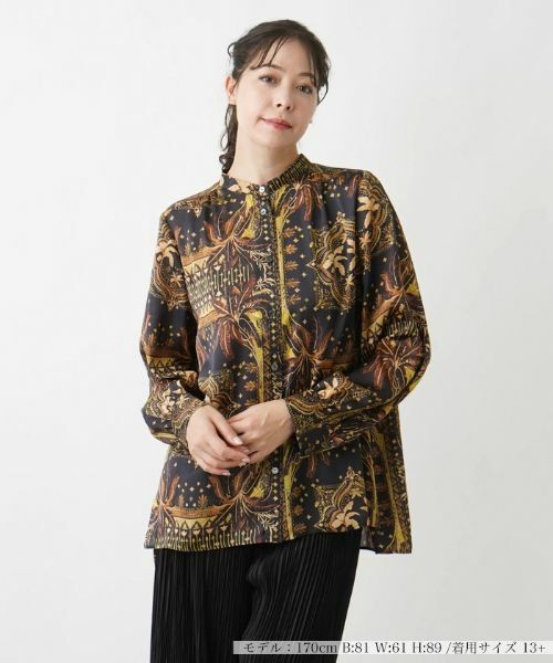 エキゾチックなボタニカル柄をプリントした、インパクト溢れるデザインのバンドカラーシャツ。ゆったりとしたバルーンスリーブで適度なリラックス感をもたせ、トレンドライクな雰囲気に。裾にはサイドスリットを入れ、絶妙なバランスの抜け感を生み出しています。ワイドパンツやミモレスカートとの相性もよく、これからの季節らしいお洒落感たっぷりのコーディネートが楽しめる一枚となっています。