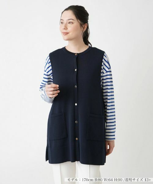 すっきりとしたIラインシルエットを描く、クルーネックロングベスト。前ウエスト左右にシンプルなスクエアポケットをバランスよくレイアウト。フロントにきらりと輝きを放つメタルボタン、バックウエストに施した飾りベルトがアクセントに。裾にはサイドスリットを入れ、動きやすさにも配慮しています。ヒップまで自然と隠れる程度の丈感で体型カバーもバッチリ。シックな色合いで様々なコーディネートに取り入れやすいアイテムです。