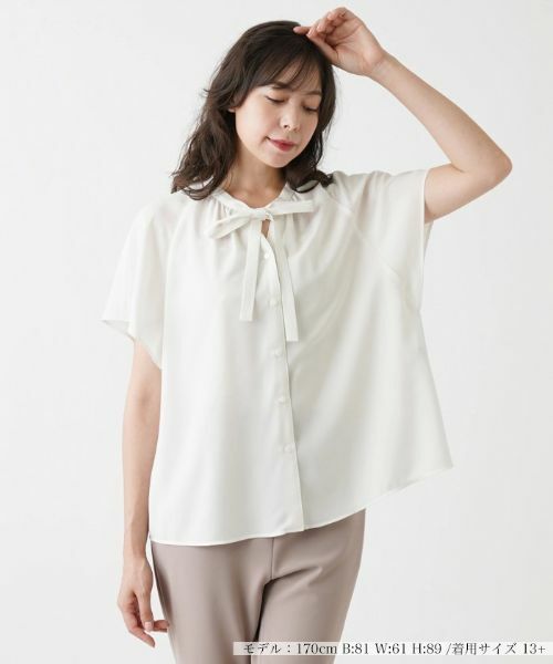 透け感のある薄手の素材で仕立てられた、バンドカラーブラウス。ナローなボウタイが上品な印象を与え、知的なムードを演出。シルエットには程よくゆとりをもたせ、ラグランスリーブで肩肘張らないリラクシーな着心地を叶えました。表面にはナチュラルなドレープ感があり、女性らしい優しげなニュアンスに仕上がります。デイリーからオフィスカジュアルまで、これからの季節の多彩なシーンで幅広く活躍してくれそうなトップスです。