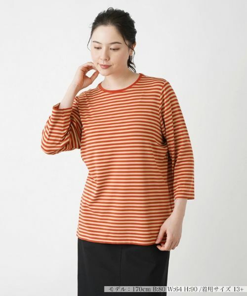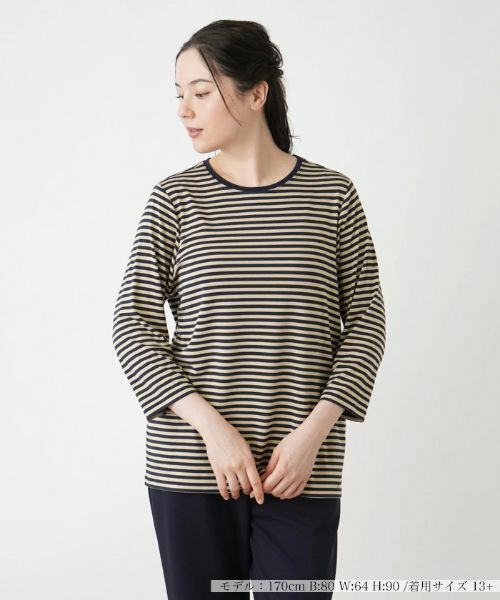シンプルなボーダーが描かれた、すっきりとしたシルエットのクルーネックプルオーバー。ネックラインは浅めに設定し、落ち着いた上品な佇まいに。クロップドスリーブが抜け感を作り、軽快なスタイリングを後押しします。やや薄手の生地は伸縮性もあるので、動きやすく着心地も快適。左裾にはワンポイントでロゴ入りのプレートがあしらわれています。一枚での着こなしはもちろん、シャツやアウターのインナーとしても使えるのでロングシーズン活躍します。