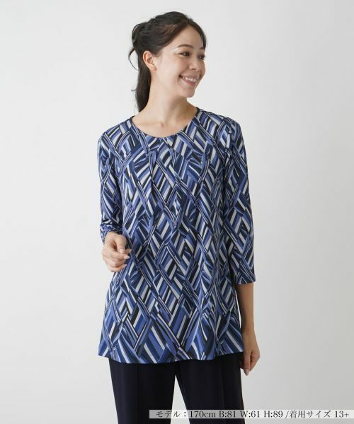 インパクト溢れるグラフィカルな幾何学柄をプリントしたトップス。ネックラインはすっきりと開き、絶妙なバランスの抜け感を演出。タックを施すことでゆとりのある柔らかなシルエットを作り出しています。バックネックの涙あきはボタン開閉が可能。ワイドパンツやミモレスカートとの相性もよく、デイリーからオフィスカジュアルまで多彩なシーンで活躍してくれそうなトップスです。