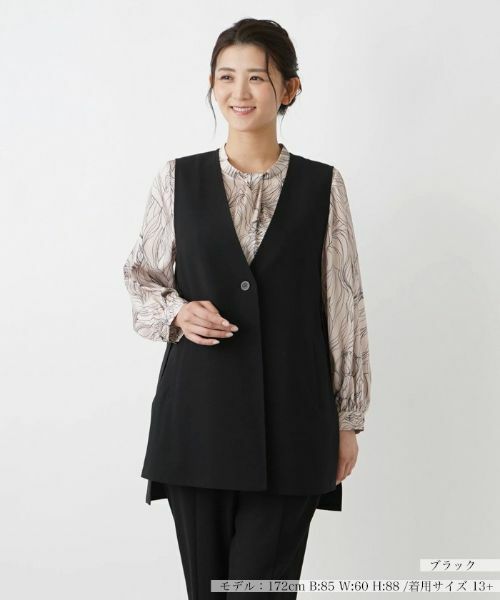シャープなVネックが抜け感を生み出すベスト。ストレッチ性のあるやや薄手のファブリックを使用し、落ち着いた色合いでデザインしました。裾には飾りボタン+サイドスリットを入れ、前後差のあるシルエットを作り、ヒップまで隠れる程度の丈感でカバーもバッチリ。お手持ちのブラウスやカットソーに重ねるだけで、大人の余裕を感じさせるレイヤードスタイルが完成する一着です。サイドボタンは飾りボタンとなっています。