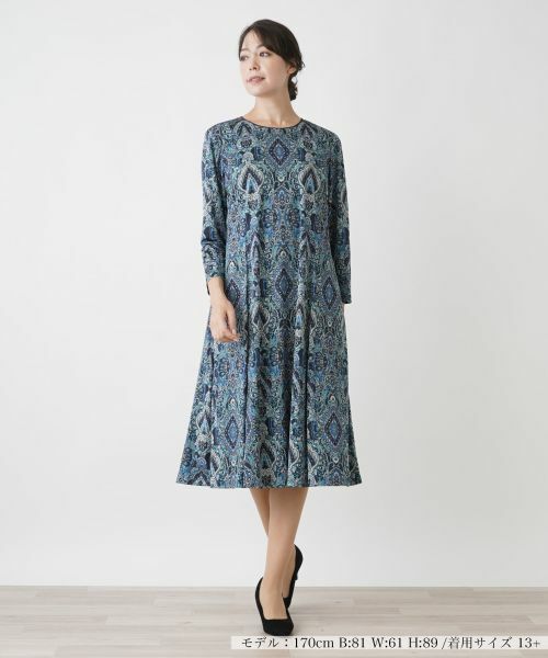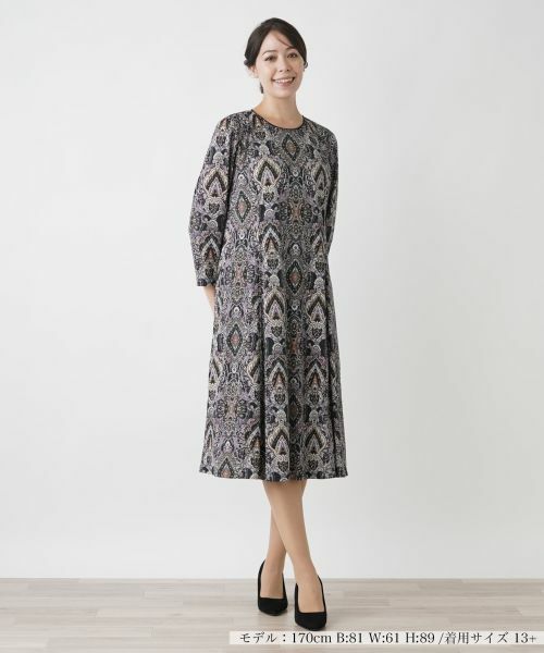 オリエンタルムードを漂わせる細やかなペイズリー柄をプリントしたワンピース。スカート部分は美しい立体感のあるフレアシルエットを生み出しています。ウエストの切り替え位置をやや高めに設定しており、脚長見せのスタイルアップ効果も期待できそうです。ベーシックなミディ丈で大人の女性らしい品のある落ち着いた印象の着こなしが完成します。足元はパンプスでまとめると、好バランスなコーディネートに。