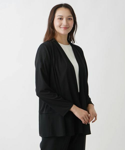 エレガントな趣を感じさせるフロントノーボタン仕様のトッパーカーディガン。裾はシアー素材で切り替え、ふわりとフレア感をもたせているため、軽やかなニュアンスに仕上がります。ヒップまでさりげなく隠れるので体型カバーにもひと役かってくれそう。落ち着いたシックな色合いで着こなしやすく、大人の女性らしいレイヤードスタイルを後押ししてくれる一枚です。パンツにもスカートにも難なく合わせられ、着回し力に優れているのも嬉しいポイント。