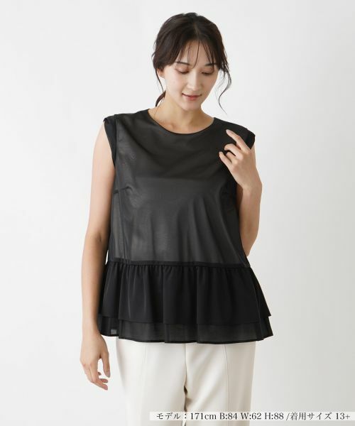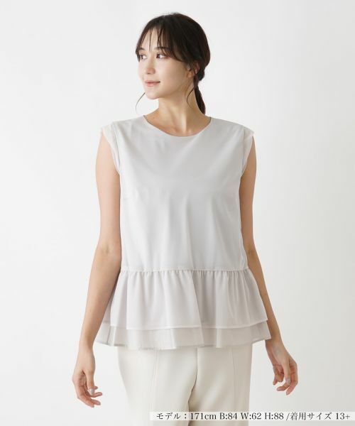 異素材で切り替えたティアードペプラムが華やかなフェミニンムードを演出するノースリーブブラウス。ネックラインは浅めに設定し、落ち着いたニュアンスに。アームホール周りにも異素材をあしらい、生地をツイストさせることで表情に変化を生み出しています。統一感のあるカラーリングでまとめているのでボトムスとも合わせやすく、コーディネート力に優れているのもポイント。バックネックの涙あきはボタンにより開閉が可能。