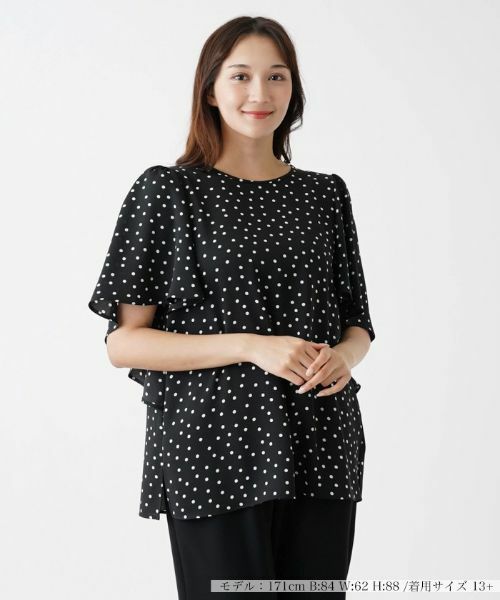 全体にシンプルなドットをちりばめたチュニックブラウス。ネックラインを浅めに設定し、上品な佇まいに仕上げました。ふわりとしたスリーブや身頃のシルエットが華やかな女性らしいムードを演出。裾にはサイドスリットを入れ、動きのあるニュアンスに。定番のベーシックなパンツでまとめるのはもちろん、フェミニンなフレアスカートを合わせても好相性のトップスです。バックネックの涙あきはボタンにより開閉が可能。
