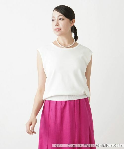 優れた着回し力が魅力のシンプルなノースリーブニットトップス。計算されたカッティングのアームホールが二の腕を美しく引き立てます。コットンにポリエステルをブレンドした、やや薄手の優しいニットの風合いが感じられる一枚。シャツやジャケットのインナーとしても活躍し、カジュアルからオフィシャルまで様々なコーディネートに対応できる使い勝手のよいアイテムです。ボトムスを選ばずに合わせやすいので、ワードローブにスタンバイしておくと重宝すること間違いなし。