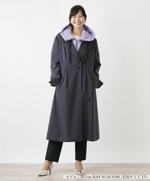 中わた入りのフーデッドライナーが付いた、マニッシュな雰囲気のロングトレンチコート。ライナーはファスナーにより首元まで閉じられ、取り外しも可能です。存在感たっぷりのカラー&ラペルが小顔効果を発揮。