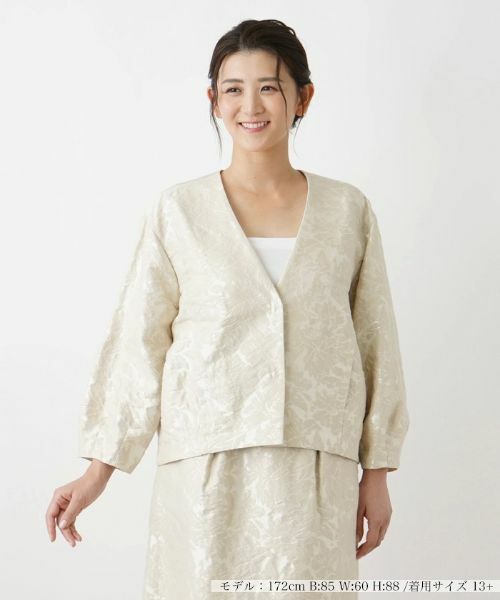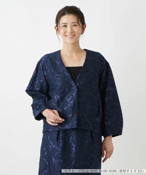 立体感のある花柄が浮かぶ、大人の女性らしい優雅な趣のVネックノーカラージャケット。深めに開いたネックラインが絶妙な抜け感を作り出しています。袖はふんわりとしたバルーンスリーブで仕上げ、リラクシーな着心地を叶えました。フロントはスナップボタンによりスムーズに着脱が行えます。前ウエスト両サイドにはシンプルなスリットポケットをバランスよくレイアウト。上品かつ落ち着いた色使いで合わせやすく、お揃いの柄のスカートとセットアップでコーディネートするのもおすすめです。