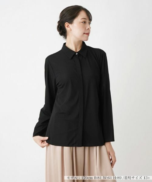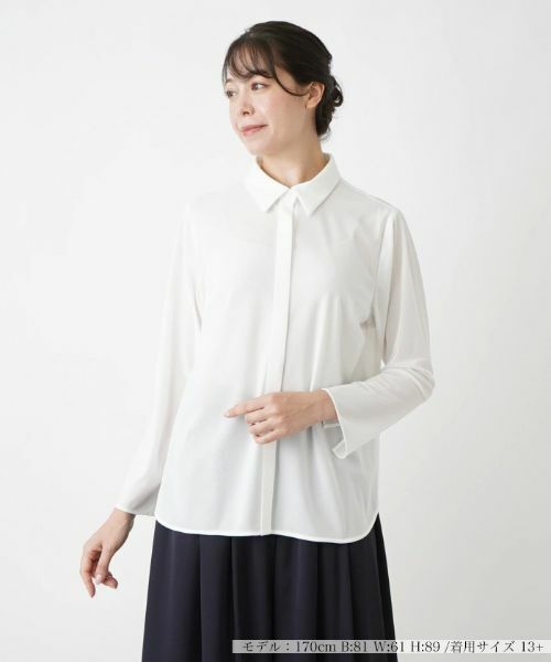 端正なフォルムの襟が洗練された大人の女性らしい着こなしをアシストする襟付きブラウス。無駄な装飾を省いたシンプルなデザインで、フロントはボタンを隠した比翼仕立てですっきりとした印象に。生地はポリエステルにストレッチ素材を混紡しているので、肌当たりがよく着心地も快適。スマートなシルエットでボトムスとも合わせやすく、パンツ・スカートを選ばずフレキシブルにコーディネートできる一枚です。