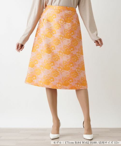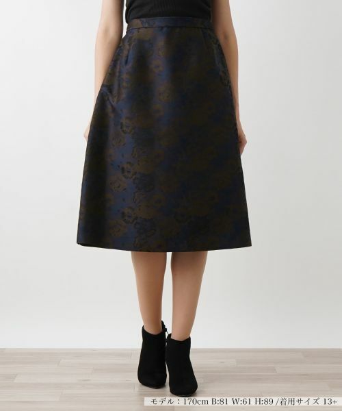 アーティスティックなボタニカル柄が表現されたミディアム丈スカート。緩やかに広がりをもたせたAラインシルエットも相俟って、ほんのり大人フェミニンなムードを演出。サイドに施されたシームラインがさりげないアクセントに。後ろホック&ファスナーにより着脱が可能。タックインすれば脚長見せのスタイルアップ効果も狙えそうです。お揃いの柄のジャケットとのセットアップコーディネートもおすすめです。
