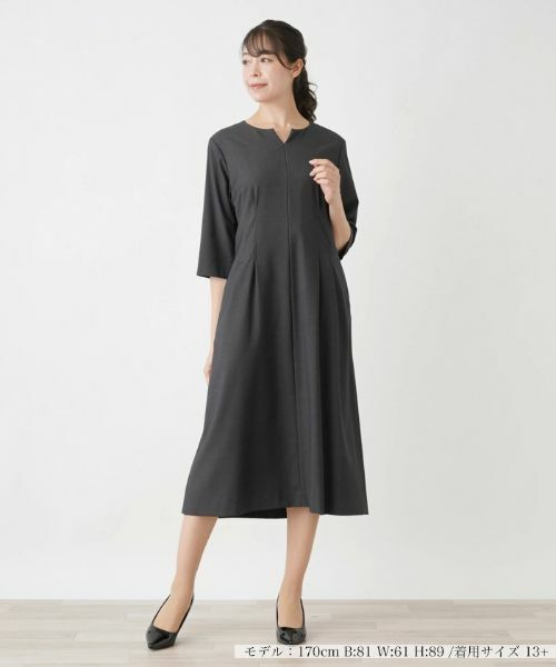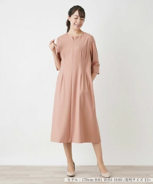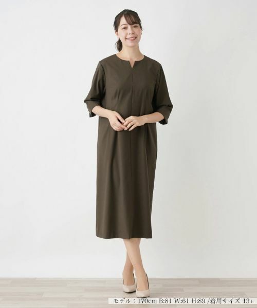 軽快な印象を与えるクロップドスリーブで仕上げたキーネックワンピース。シャープなカッティングを施したネックラインが絶妙な抜け感を演出。ウエストシェイプした巧妙なパターンメイクと、タックにより美しいシルエットを表現。オーソドックスな膝丈で着こなしやすく、大人の女性らしいエレガントなスタイルが手軽に楽しめます。高めのウエスト両サイドにはシンプルなスリットポケットをレイアウト。オフィスカジュアルから週末のお出かけまで、多彩なシーンで活躍してくれそうなアイテムです。バックファスナーで開閉が可能。