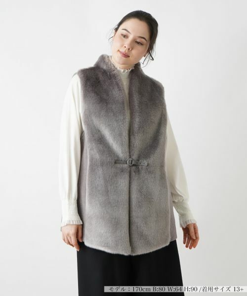 フロント部分を毛並みの揃った美しいフェイクファーで切り替えた、大人の女性らしいラグジュアリーな雰囲気のスタンドカラーベスト。統一感のある落ち着いた色合いでデザインしているので様々なインナーやボトムスとコーディネートしやすく、着回し力に優れたアウターです。すっきりとしたスマートなシルエットで上級者らしいレイヤードスタイルが手軽に楽しめる一着です。前立てはベルトにより開閉が可能。