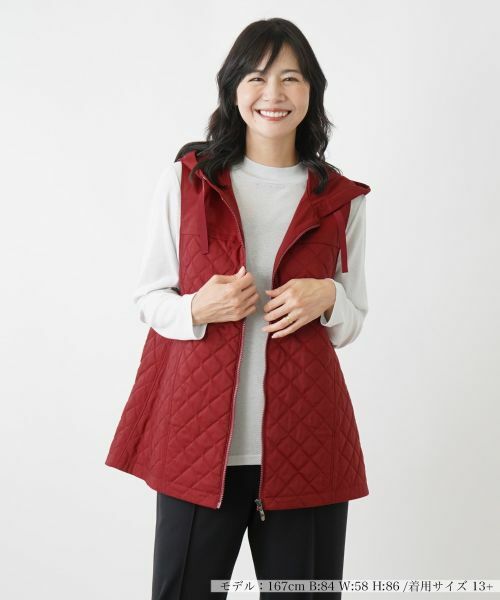 程よくボリュームを抑えた中わた入りのフーデッドキルティングベスト。大きめのフードが存在感を放ち、インパクトたっぷりに仕上がります。ニットやカットソーに重ねるだけで上級者らしいこなれ感のあるレイヤードコーデが完成するアイテムです。フロントはジップアップ仕様でスムーズに着脱が可能。前ウエスト両サイドには小さめのスリットポケットをレイアウト。