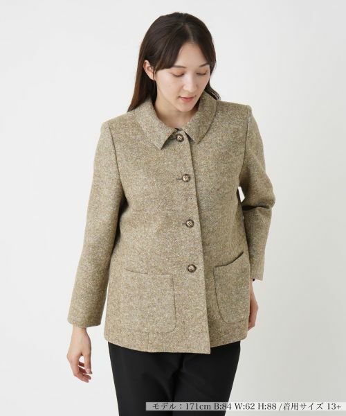 ネップ感のあるミックスツイード生地で仕立てた、上品な印象のステンカラージャケット。短めの襟が大人の女性らしいエレガンスを漂わせ、洗練された佇まいを演出。マーブルボタンを採用し、細部までこだわりが感じられるディテールをプラス。ウエストにはシンプルなパッチポケットをレイアウトし、実用性とスタイリッシュさを両立。すっきりとしたシルエットで、パンツやスカートともバランスよく合わせやすく、オンオフ問わず幅広いシーンで活躍する一着です。