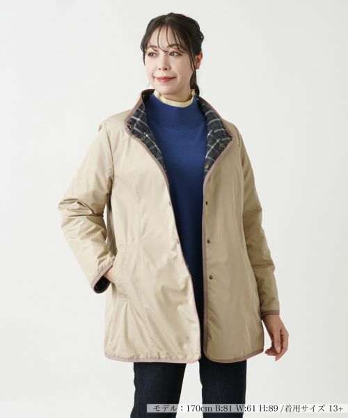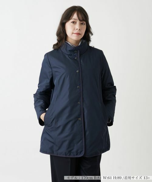 スタンドカラーが上品な印象を与える中わた入りハーフコートは、軽やかで暖かく、秋冬シーズンにぴったりです。シンプルながらも細部にまでこだわったデザインが魅力で、リバーシブル仕様によりシーンや気分に合わせて異なる表情を楽しめます。エレガントでありながら日々のお出かけに優れたコート。ワードローブに加えることで、装いの幅が広がります。