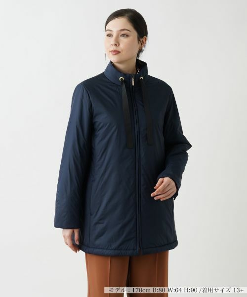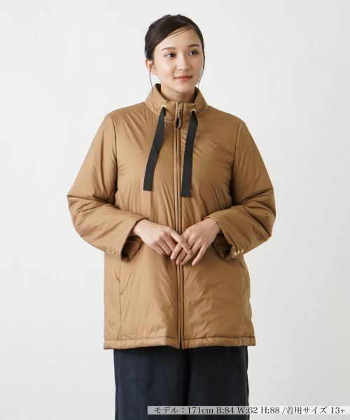 程よくボリュームを抑えつつ、キャメルの中わたを詰め込んだ、保温性抜群のスタンドカラーショートコート。ベーシックな無地で、オンオフ問わず幅広いシーンで活躍する汎用性の高いアウターです。フロントはフルジップ仕様でしっかりと閉じられ、冷たい風をしっかりシャットアウト。襟には太めのドローコードが付いており、フィット感を自由に調整できるのも魅力です。ウエスト内側にはラクダモチーフの刺繍テープを施してさりげないアクセントに。袖口はスナップボタンで開閉が可能です。