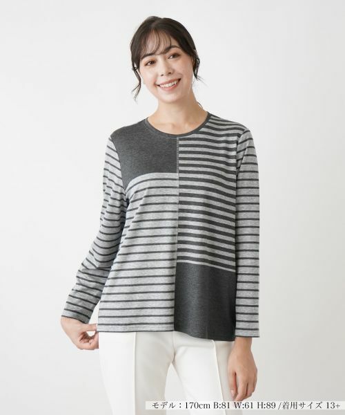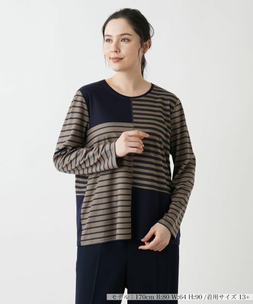 パッチワーク調にボーダーと無地を合わせたデザインカットソー。TOP調の色合いでニュアンスのある印象。肌触りがよく柔らかいのが特長。------------------------------------着用シーズン:秋伸縮性:あり透け感:ありポケット:なし生地の厚さ:やや薄手お取扱い方法:ウォッシャブル(手洗い可)裏地:なし-------------------------------------※商品の色味は、撮影場所や光のあたり具合、お客様のお使いの機器により色味が違って見える場合がございます。予めご了承ください。手洗い可酸素系漂白可タンブル乾燥不可つり干し(日陰)アイロン低温160℃までドライクリーニング可ウェットクリーニング(弱い処理)