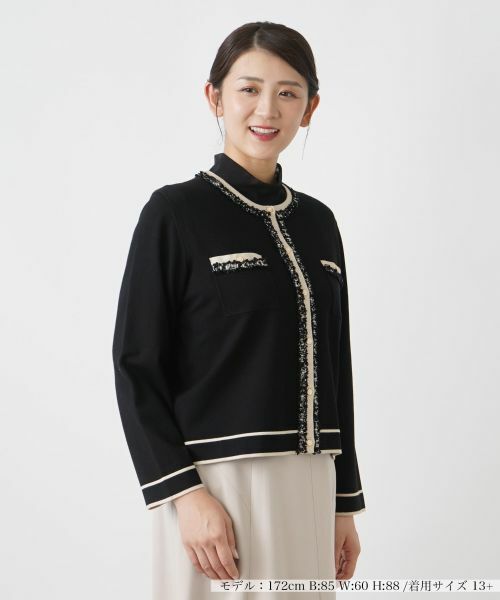 ブレードテープをあしらった華やかなカーディガン。ハリ感とストレッチ性のある素材なので、動きやすくジャケット感覚でご着用いただけます。配色のラインとラメ糸を使ったブレードを効果的に配置することでお顔周りを華やかにみせてくれます。