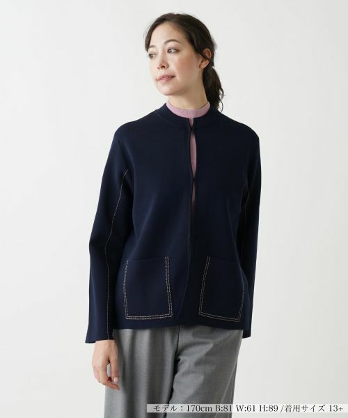 肌触りのよい薄手の生地で仕立てたジャケット。軽やかな着心地ながら、しっかりとした作りで季節の変わり目に重宝しそうです。スリーブ部分や前ウエスト両サイドのポケットには細やかなステッチを加えることでユニークなアクセントに。フロントは鍵ホックで開閉できる仕様となっており、すっきりとしたミニマルな印象を演出。ワイドパンツやミモレ丈スカートとも相性がよく、さまざまなスタイルに取り入れやすい着回し力抜群の一着です。