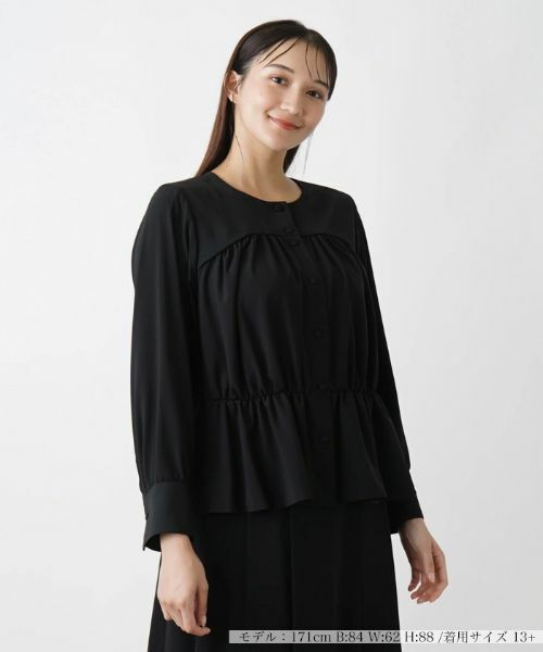 異素材を巧みに組み合わせたお洒落な佇まいのノーカラーブラウス。全体にたっぷりと施されたギャザーが、柔らかく上品なニュアンスを引き立てます。ペプラムシルエットが、大人の女性らしいフェミニンな雰囲気を漂わせる一着に仕上げました。くるみボタンを採用することで、細部にまでこだわりが光るデザインとなっています。シンプルでありながらも、ディテールに宿る上質感が際立つ一枚。