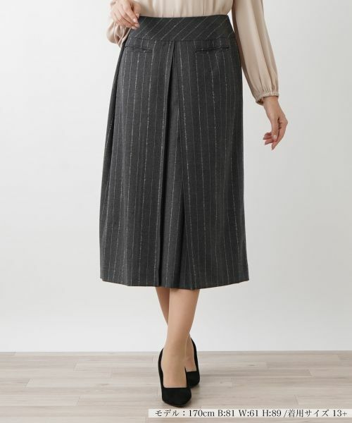 ほんのりとラメが煌めく、レトロシックなピンストライプ生地で仕立てたミモレスカート。フロント中央に施されたインバーテッドプリーツが端正なシルエットを作り出します。ハイウエストでスタイリングできるので、タックインすれば脚長見せのスタイルアップ効果も期待できそうです。前ウエスト左右にシンプルなスリットポケットをレイアウト。後ろホック&ファスナーにより開閉が可能です。