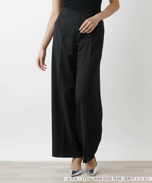 脚長見せのスタイルアップ効果が狙えそうなハイライズ仕様のワイドパンツ。ハイウエストで程よくシェイプしつつ、レッグラインはゆったりと広がりをもたせ、リラックス感溢れるシルエットをメイク。しっかりとセンタープレスを付けているので上品な印象に仕上がります。バックウエストのみゴム仕様とし、心地よいフィット感をもたせました。ベーシックな無地で合わせやすく、同素材のトップスとセットアップでコーディネートするのもおすすめです。