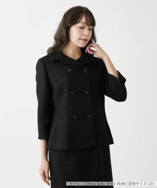 シンプルで上品なブラックのジャケットです。生地はやや厚みがあり、表面に織り柄のようなテクスチャーが施されていて、高級感を感じさせます。余計な装飾がなく、フォーマルなシーンからカジュアルなスタイルまで幅広く活用できるデザインです。黒のシンプルさがどんなアイテムとも合わせやすく、着回しがしやすい一着です。家庭洗濯不可漂白不可タンブル乾燥不可アイロン低温120℃まで石油系溶剤ドライクリーニング弱ウェットクリーニング不可