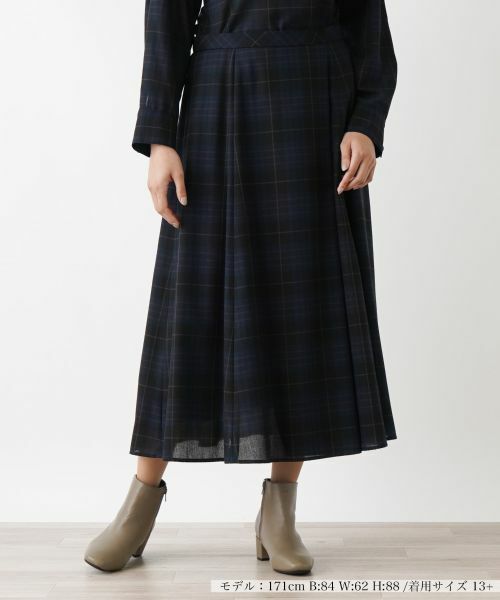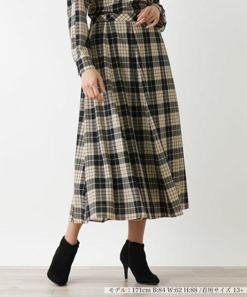 クラシカルな趣のタータンチェックが彩るロングスカート。ウエストシェイプしつつ、裾に向かって広がりをもたせた美しいAラインシルエットがエレガントな女性らしさを引き立てます。バックウエストはゴム仕様で心地よいフィット感をもたせました。サイドホック&ファスナーにより着脱が可能。シンプル見えするので着こなしやすく、お揃いの柄のブラウスとのセットアップ風コーディネートもおすすめです。