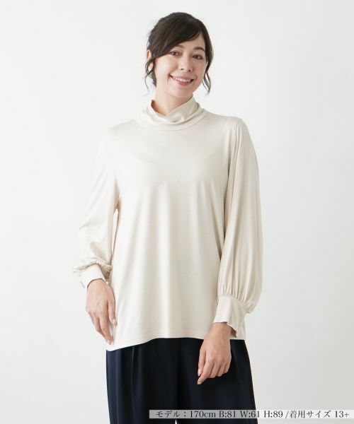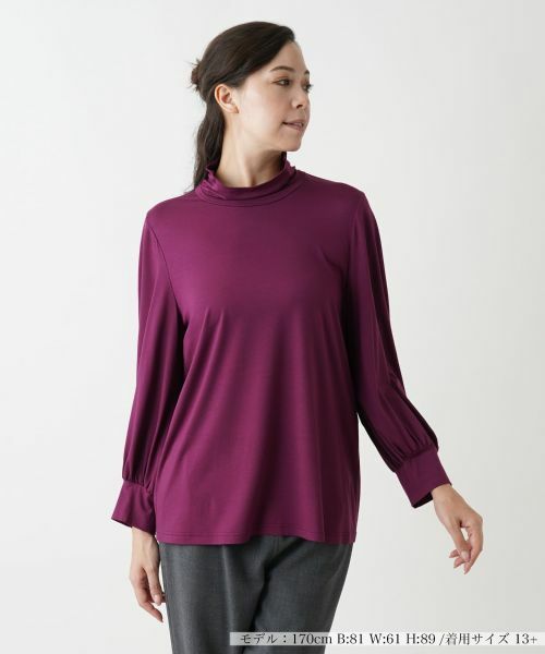 大人の女性らしいリュクス感溢れるデザインのハイネックカットソー。レーヨンにストレッチ素材を混紡した優しい肌触りのファブリックを使用しています。シャーリングを施したギャザースリーブが存在感を放ち、トレンドライクな雰囲気を演出。身頃はすっきりとしたシルエットで着こなしやすく、ボトムスと気軽にコーディネートできるのも嬉しいポイント。