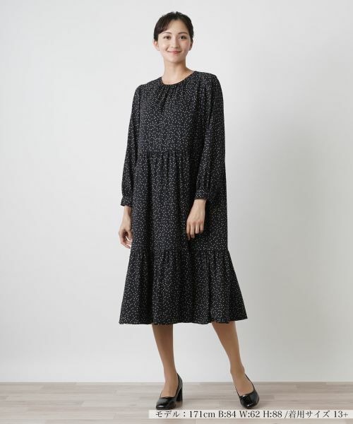 細やかなドットをちりばめた、ティアード切り替えのミディ丈フレアワンピース。ふんわりとしたボリュームスリーブやゆったりとした身頃のシルエットがリラクシーな印象を与えます。着た際にナチュラルなドレープ感が生まれ、女性らしい柔らかな表情を作り出します。身体のラインを拾いにくく、手軽に体型カバーできるのも嬉しいポイント。ネックラインは浅めに設定し、上品なニュアンスに。バックファスナーにより着脱が可能。